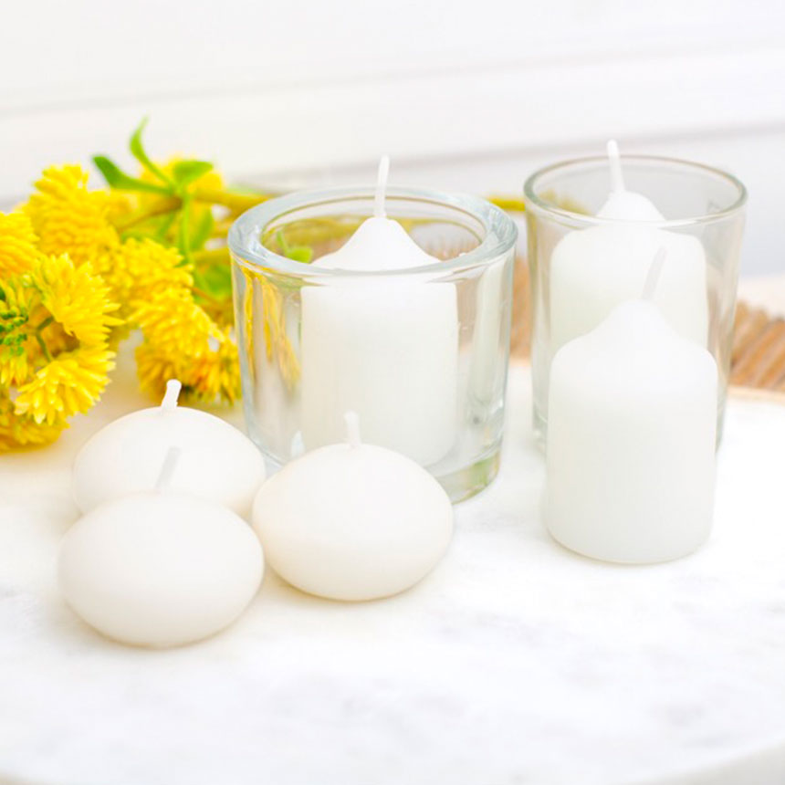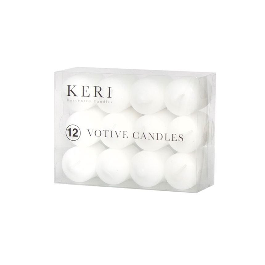 Our 12-pack of white votive candles is a great buy. Charming as a standalone item in a votive candle holder, or as part of a candle arrangement. Burn time of each votive is normally 12 hours.